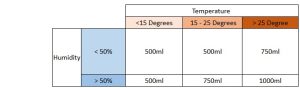 Como já mencionámos, é uma bebida que fornece grandes quantidades de carboidratos, que não devem ser confundidos com uma bebida de hidratação, pelo que é essencial acompanhá-la com água adicional durante a sua utilização para promover a digestibilidade.Abaixo mostramos a quantidade de água adicional por UNUSUAL FUEL 100CHO diluído em 500ml, dependendo da temperatura e da humidade. Deve-se ter em mente que estes valores são sempre aproximados, uma vez que cada organismo responde de forma diferente ao esforço, à humidade e às altas temperaturas.