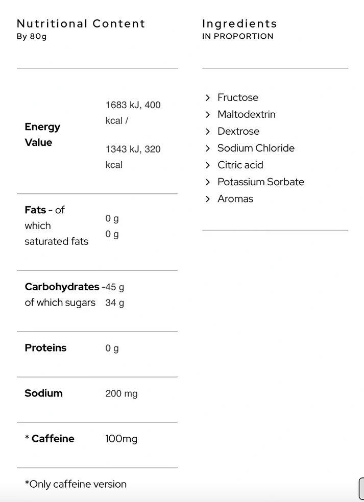 UNUSUAL GEL 45CHO contains 200mg of sodium per gel, which makes it perfect for avoiding additional consumption of mineral salts (depending on strategy).